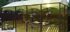 4. Колір. Прозорий, який відмінно пропускає світло, або бронзовий чи опаловий. Останні у спеку створюють затінок та прохолоду. У такій альтанці дуже комфортно влітку.